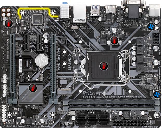 Model - Gigabyte GA-B365M HD3, CPU Sockets - LGA1151, Chipset - Intel B365 Express, Supported CPU - 9th/8th Generation Intel Core i9 / i7 / i5 / i3 / Pentium / Celeron Processors, Generation - 8th/9th, Memory Type - DDR4, Memory MHz - 2666/2400/2133MHz, Memory Channel - Dual Channel, Memory Slot - 2, Memory Max. - 32GB, Optane Memory Support - Yes, Graphic - Onboard Graphics, Multi-GPU Support - AMD Quad-GPU CrossFire and 2-Way AMD CrossFire, PCI Express Slot - 1 x PCI Express x16 slot, running at x16 (PCIEX16), 1 x PCI Express x16 slot, running at x4 (PCIEX4), 2 x PCI Express x1 slots, Storage Interface - 6Gb/s, M.2 Slot - 1 x M.2 Socket 3 (type 2242/2260/2280 SATA and PCIe x4/x2 SSD support), LAN Chipset - Realtek GbE LAN, LAN Speed (Mbps) - 10/100/1000Mbps, Audio Chipset - Realtek ALC887, Audio Channel - 2/4/5.1/7.1-channel, WiFi - No, Bluetooth - No, USB Port - 6 x USB3.1 Gen 1, 6 x USB2.0, VGA Port - 1, DVI Port - 1, HDMI Port - 1, DisplayPort (DP) - No, IDE Port - No, SATA Port - 6 x SATA, BIOS Type - 2 x 128 Mbit flash, BIOS Model - AMI UEFI BIOS, BIOS Version - PnP 1.0a, DMI 2.7, WfM 2.0, SM BIOS 2.7, ACPI 5.0, FireWire - No, CrossFire Support - Yes, Sli Support - No, RaidSupport - 0,1,5,10, Thunderbolt - No, TPM Port - Yes, COM Port - No, Form Factor - Micro ATX, Supported Operating System - Windows 10, Special Features - Ultra Durable motherboard with GIGABYTE 8118 Gaming LAN, PCIe Gen3 x4 M.2, Anti-Sulfur Resistor, Smart Fan 5, DualBIOS, CEC 2019 ready, Dual Channel Non-ECC Unbuffered DDR4, New Hybrid Digital PWM Design, High Quality Audio Capacitors and Audio Noise Guard with LED Trace Path Lighting, Ultra-Fast M.2 with PCIe Gen3 X4 & SATA interface, GIGABYTE Exclusive 8118 Gaming LAN with Bandwidth Management, CEC 2019 Ready, Save the Power as Easy as One Click, Smart Fan 5 features Multiple Temperature Sensors and Hybrid Fan Headers with FAN STOP, Anti-Sulfur Resistors Design, Ultra Durable 15KV Surge LAN Protection, Intel Optane Memory Ready, GIGABYTE UEFI DualBIOS, Others - 1 x M.2 Socket 3, 1 x CPU fan header, 1 x system fan header, 1 x front panel header, 1 x front panel audio header, 1 x Trusted Platform Module (TPM) header, 1 x parallel port header, 1 x serial port header, 1 x Clear CMOS jumper, 3 x audio jacks, Warranty - 3 Year, Country of Origin - Taiwan, Made in/ Assemble - China