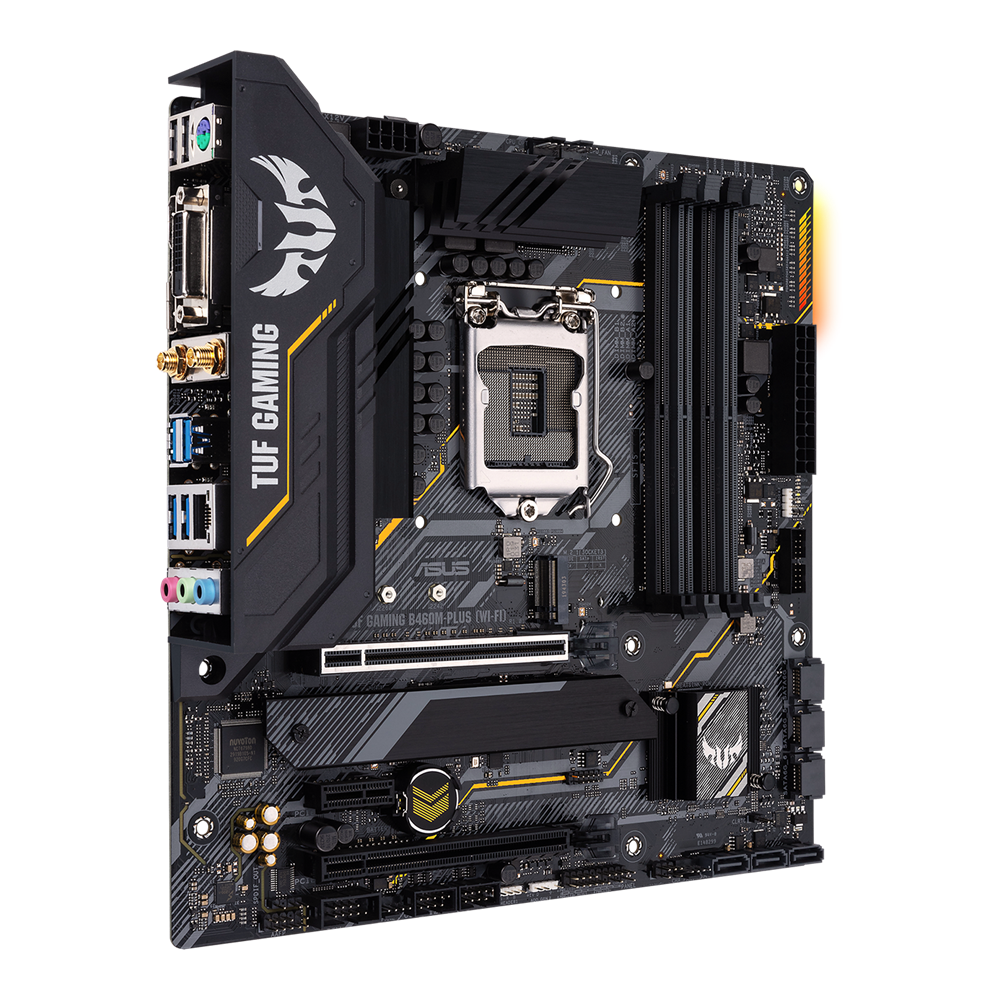 TUF Gaming B460M-PLUS (Wi-Fi) distills essential elements of the latest Intel platform and combines them with game-ready features and proven durability. Engineered with military-grade components, an upgraded power solution, and a comprehensive set of cooling options, this motherboard delivers rock-solid performance with unwavering gaming stability. When you build with a TUF Gaming motherboard, you also benefit from the TUF Gaming Alliance — an ASUS collaboration with trusted industry partners that ensures easier building, the best compatibility, and complementary aesthetics from components to case. With upgraded power delivery and comprehensive cooling options to fuel the latest Intel® CPUs, plus support for faster memory and storage, TUF Gaming B460M-PLUS (Wi-Fi) is the perfect foundation for your next high-core-count battle rig. TUF Gaming motherboards are designed to be easy to set up and configure just the way you want —even for first-time builders. The TUF Gaming Alliance eco-system makes selecting compatible parts easy, while Armoury Crate software offers full control of system settings via a single dashboard. TUF Gaming motherboards give you everything you need to build your dream gaming rig without adding complexity. TUF Gaming Alliance is a collaboration between ASUS and trusted PC-component brands to ensure compatibility with a wide range of parts, such as PC cases, power supplies, CPU coolers, memory kits, and more. With more partnerships and components being added regularly, the TUF Gaming Alliance will continue to grow even stronger. TUF Gaming B460M-PLUS (Wi-Fi) provides a complete, high-performance gaming package with a long list of features to improve your experience, including ultrafast networking for smoother online gameplay, pristine audio with positional cues for FPS gaming, and onboard RGB lighting that syncs with attached accessories to help you create a personalized gaming atmosphere. The Intel WiFi 6 AX200 module is compatible with the 802.11ax standard and pushes theoretical peak bandwidth up to an incredible 2.4 Gbps. Perhaps more importantly for power users, it's optimized for more efficient operation on crowded networks with a lot of competing traffic. Pair your motherboard with ASUS WiFi 6 routers to fully experience the networking potential of WiFi 6. Intel Ethernet Connection I219-V reduces CPU overhead and offers exceptionally high TCP and UDP throughput for faster, smoother data transfer. Turbo LAN with cFosSpeed traffic-shaping technology allows you to configure application priority via an intuitive interface and reduces network lag.
