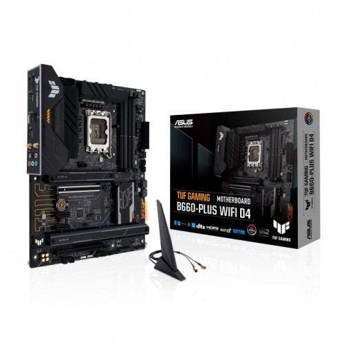 The Asus TUF GAMING B660-PLUS WIFI D4 is supported with 12th Gen Intel Core, Pentium Gold and Celeron Processors, Intel Socket LGA1700 socket. It comes with upgraded power delivery and comprehensive cooling options to drive the 12th Gen Intel Core processors, plus support for faster memory and storage. The onboard VRMs feature 10+1 DrMOS power stages that combine high-side and low-side MOSFETs and drivers into a single package, delivering the power and efficiency that 12th Gen Intel Core processors demand. The Asus TUF GAMING B660-PLUS WIFI D4 provides a high-performance gaming package with a long list of features to improve your experiences, including ultrafast networking for smoother online gameplay, pristine audio with positional cues for FPS gaming, and onboard RGB lighting that syncs with attached accessories to help you create a personalized gaming atmosphere. It offers an enlarged VRM heatsink, Stack Cool 3+, M.2 heatsinks, PCH heatsink, hybrid fan headers, and Fan Xpert 4 utility. It comes with PCIe 5.0 slot, PCIe 4.0 M.2 slots, rear USB 3.2 Gen 2x2 Type-C, front panel header for USB 3.2 Gen 2 Type-C, and Thunderbolt 4 header support. It supports Two-way AI Noise-Cancelation. It reduces background noise from the microphone and audio output for crystal-clear communication in games or video conferences. The Asus TUF GAMING B660-PLUS WIFI D4 comes with 3 years of warranty.