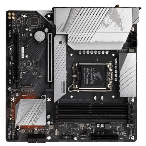 Gigabyte B660M AORUS PRO AX DDR4 Motherboard continues the legendary AORUS bloodline with the most robust power delivery and dominant thermal design, glorified with the complete memory overclocking technology to crown your PC with the best Alder Lake’s performance in all its gaming glory.With technology moving so fast, GIGABYTE still keep up with the latest trends and provide our customers with advanced features and latest technology. Gigabyte B660M AORUS PRO AX Motherboard come with upgraded power solution, latest storage standards and outstanding connectivity to enable optimize performance for gaming.Gigabyte B660M AORUS PRO AX Motherboard Un-throttled performance is guaranteed by innovative and optimized thermal design to ensure the best CPU, Chipset, SSD stability and low temperatures under full load application and gaming.Gigabyte B660M AORUS PRO AX Motherboard let you experience ultimate connection flexibility and blazing data-transfer speed with next generation network, storage.GIGABYTE motherboards bundle several useful and intuitive software to help users to control every aspect of motherboard and provide customizable lighting effect with outstanding aesthetics to fit your unique personality.GIGABYTE Ultra Durable™ features its product durability and high-quality manufacturing process. GIGABYTE motherboards use the best components and reinforce every slots to make each of them solid and durable.