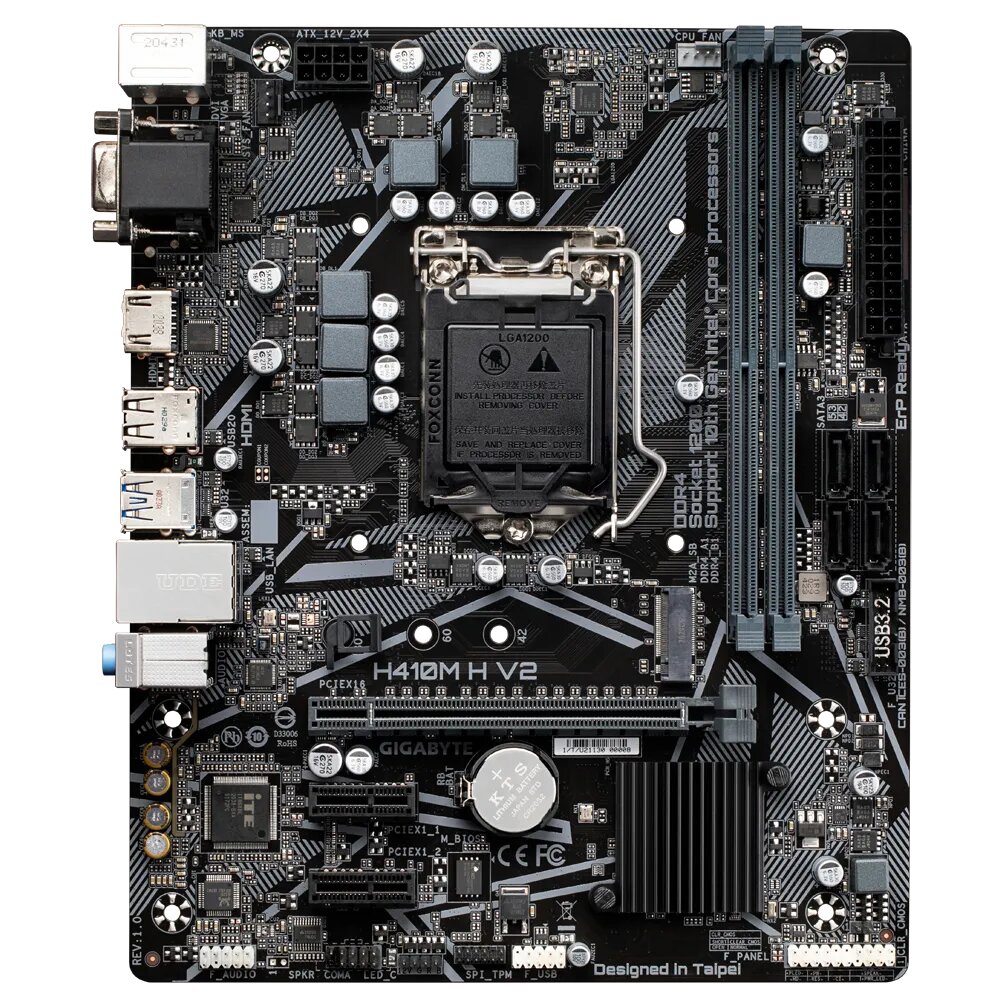 Brand - Gigabyte, Model - Gigabyte H410M H V2, Chipset Brand - Intel, Chipset - Intel H470 Express, CPU Sockets - LGA1200, Supported CPU - Intel Core i9, i7, i5, i3, Pentium, Celeron processors, Generation - 10th Gen, Memory Type - DDR4, Memory MHz - 2933/ 2666/ 2400/ 2133 MHz, Memory Channel - Dual, Memory Slot - 2, Memory Max. - 64GB, Optane Memory Support - Yes, Graphics - Intel HD Graphics, PCI Express Slot - 1 x PCI Express x16 slot, running at x16, 2 x PCI Express x1 slots, Storage Interface - 6Gb/s, M.2 Slot - 1 x M.2, type 2242/2260/2280 SATA and PCIe x4/x2 SSD, LAN Chipset - Intel GbE LAN, LAN Speed (Mbps) - 10/100/1000 Mbit, Audio Chipset - Realtek Audio CODEC, Audio Channel - 2/4/5.1/7.1-channel, USB Port - 6 x USB 3.2 Gen 1, 10 x USB 2.0, VGA Port - 1, HDMI Port - 1, SATA Port - 4, BIOS Type - 1 x 256 Mbit flash, BIOS Model - AMI UEFI BIOS, BIOS Version - PnP 1.0a, DMI 2.7, WfM 2.0, SM BIOS 2.7, ACPI 5.0, RaidSupport - 0, 1, 5, 10, TPM Port - Yes, RGB Support - Yes, RGB Connector - 1 x RGB LED strip header, Form Factor - Micro ATX, Supported Operating System - Windows 10, Special Features - Intel H470 Ultra Durable Motherboard with Intel GbE LAN, Anti-Sulfur Resistor, Smart Fan 5, Supports 10th Gen Intel Core Processors, Dual Channel Non-ECC Unbuffered DDR4, 2 DIMMs, 8-Channel HD Audio with High Quality Audio Capacitors, NVMe PCIe Gen3 x4 2280 M.2 Connector, Intel GbE LAN with cFosSpeed Internet Accelerator Software, Smart Fan 5 features Multiple Temperature Sensors and Hybrid Fan Headers with FAN STOP, GIGABYTE APP Center, Simple and Easy Use, Anti-Sulfur Resistors Design, Others - HDMI version: 1.4 and HDCP version: 2.3, 1 x 24-pin ATX main power connector, 1 x 8-pin ATX 12V power connector, 1 x CPU fan header, 1 x system fan header, 1 x front panel header, 1 x front panel audio header, 1 x serial port header, 1 x Clear CMOS jumper, 1 x RJ-45 port, 3 x audio jacks, Warranty - 3 Year
