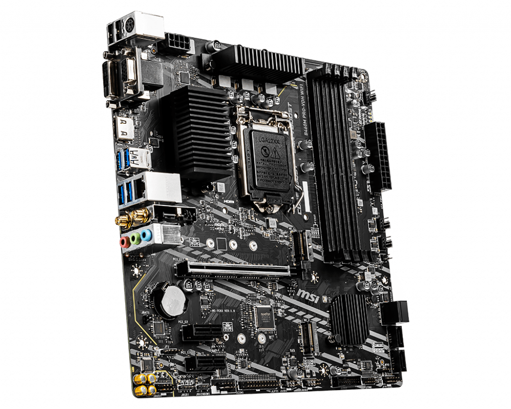 Brand - MSI, Model - MSI B460M PRO-VDH WIFI, CPU Sockets - LGA1200, Chipset - Intel B460 Chipset, Supported CPU - Intel Core and Pentium Gold / Celeron processors, Generation - 10th, Memory Type - DDR4, Memory MHz - Intel Core i7/ i9 (2933MHz), Intel Core i5 and below (2666/ 2400/ 2133MHz), Memory Channel - Dual Channel, Memory Slot - 4, Memory Max. - 128GB, Optane Memory Support - Yes, Multi-GPU Support - No, PCI Express Slot - 1x PCIe 3.0 x16 (from CPU), 2 x PCIe x1 (from PCH), Storage Interface - 6Gb/s, M.2 Slot - 2x M.2 (1x M2 (supports up to PCIe 3.0 x4 and SATA 6Gb/s, 2242/ 2260/ 2280/ 22110 storage devices), 1 x M2 (supports up to PCIe 3.0 x4, 2242/ 2260/ 2280 storage devices)), LAN Chipset - Realtek RTL8111H Gigabit, Audio Chipset - Realtek ALC892, Audio Channel - 7.1-Channel, Wi-Fi - Yes, Wi-Fi Technology - Intel Dual Band Wireless-AC 3168, Supports Wi-Fi 802.11 a/b/g/n/ac, dual band (2.4GHz, 5GHz) up to 433 Mbps speed., Bluetooth - Bluetooth 4.2, USB Port - 6 x USB3.2 Gen 1 5Gbps (Type-A), 6 x USB2.0, VGA Port - 1, DVI Port - 1, HDMI Port - 1, DisplayPort (DP) - No, IDE Port - No, SATA Port - 4 x SATA, DirectX Support - 12, FireWire - No, CrossFire Support - No, Sli Support - No, RaidSupport - 0, 1, 5, 10, Thunderbolt - No, TPM Port - Yes, COM Port - No, Form Factor - mATX, Supported Operating System - Windows 10, Special Features - Core Boost With premium layout and optimized power design to support more cores and provide better performance, DDR4 Boost Advanced technology to deliver pure data signals for the best gaming performance and stability, EZ Debug LED Easiest way to troubleshoot, PCI-E Steel Armor Protecting VGA cards against bending and EMI Intel WiFi solution Build in Intel Wi-Fi / Bluetooth, delivering AC speeds up to 433Mbps without any cable limitation, Mystic Light Extension Control additional RGB or Rainbow strip added to your system with Dragon Center, Audio Boost Reward your ears with studio grade sound quality for the most immersive audio experience, Supports 10th Gen Intel Core / Pentium Celeron processors for LGA 1200 socket, Supports DDR4 Memory, up to 2933(Max) MHz, Core Boost: With premium layout and digital power design to support more cores and provide better performance, DDR4 Boost: Advanced technology to deliver pure data signals for the best performance and stability, Twin Turbo M.2: Running at PCI-E Gen3 x4 maximizes performance for NVMe based SSDs, Audio Boost: Reward your ears with studio grade sound quality, Steel Armor: Protecting VGA cards against bending and EMI for better performance, stability and strength, Others - Wi-Fi / BT: Intel Wireless-AC 3168 / Bluetooth 4.2, 1 x 24-pin ATX main power connector, 1 x 8-pin ATX 12V power connector, 1 x 4-pin CPU fan connector, 1x 4-pin water pump connector, 2 x 4-pin system fan connectors, 1 x front panel audio connector, 2 x system panel connectors, 1 x parallel port connector, 1 x serial port connector, 1 x Chassis Intrusion connector, 1 x Clear CMOS jumper, 1 x 4-pin RGB LED connector, 1 x 3-pin RAINBOW LED connector, 1 x TPM module connector, Warranty - 3 Year