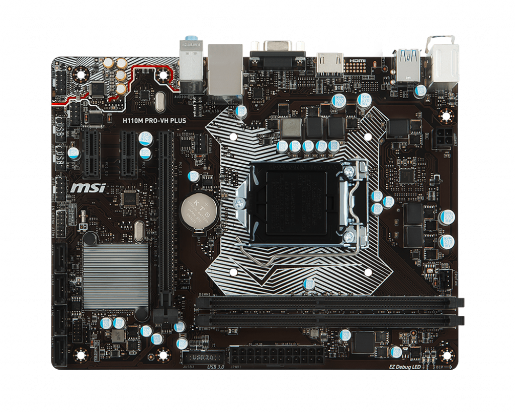 MSIH110M PRO-VH PLUS, CPU Sockets - LGA 1151, Chipset - Intel H110, Supported CPU -7th / 6th Gen Intel Core i3 / i5 / i7 / Pentium / Celeron processors, MemoryType - DDR4, Memory MHz - 2133MHz, Memory Channel - Dual, Memory Slot - 2,Memory Max. - 32GB, Optane Memory Support - No, PCI Express Slot - 1 x PCIExpress 3.0 x16, 2 x PCI Express 2.0 x1, Storage Interface - 6Gb/s, LAN Chipset- Realtek RTL8111H, LAN Speed (Mbps) - 10/100/1000Mbps, Audio Chipset - RealtekALC887, Audio Channel - 6-channel, USB Port - 4 x USB3.1, 6 x USB2.0, VGA Port- 1, HDMI Port - 1, SATA Port - 4 x SATA III, DirectX Support - DX12, FormFactor - M-ATX, Warranty - 3 Years.
