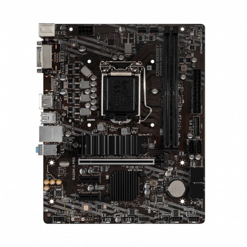 Brand - MSI, Model - MSI B460M-A PRO, CPU Sockets - LGA1200, Chipset - Intel B460, Supported CPU - Intel Core and Pentium Gold / Celeron processors, Generation - 10th, Memory Type - DDR4, Memory MHz - Intel Core i7/ i9 (2933MHz), Intel Core i5 and below (2666/ 2400/ 2133MHz), Memory Channel - Dual Channel, Memory Slot - 2, Memory Max. - 64GB, Optane Memory Support - Yes, Graphic - Integrated Graphics, Multi-GPU Support - No, PCI Express Slot - 1x PCIe 3.0 x16 slot, 2x PCIe 3.0 x1 slots, Storage Interface - 6Gb/s, M.2 Slot - 1 x M.2 (Supports up to PCIe 3.0 x4 and SATA 6Gb/s, 2242/ 2260/ 2280 storage devices), LAN Chipset - Realtek 8111H, LAN Speed (Mbps) - 10/100/1000, Audio Chipset - Realtek ALC892, Audio Channel - 7.1-Channel, Wi-Fi - No, Bluetooth - No, USB Port - 6 x USB3.2 Gen 1, 6 x USB2.0, VGA Port - No, DVI Port - 1, HDMI Port - 1, DisplayPort (DP) - No, IDE Port - No, SATA Port - 6 x SATA, DirectX Support - 12, BIOS Type - 1 x 128 Mbit Flash, BIOS Model - UEFI AMI BIOS, FireWire - No, CrossFire Support - No, Sli Support - No, RaidSupport - 0,1.5,10, Thunderbolt - No, TPM Port - Yes, COM Port - No, Form Factor - Micro ATX, Supported Operating System - Windows 10, Special Features - Core Boost, With premium layout and digital power design to support more cores and provide better performance, DDR4 Boost, Advanced technology to deliver pure data signals for the best performance and stability, M.2 Shield Frozr, Strengthened built-in M.2 thermal solution, Keeps M.2 SSDs safe while preventing throttling, making them run faster, Turbo M.2, Running at PCI-E Gen3 x4 maximizes performance for NVMe based SSDs, Audio Boost, Steel Armor, Protecting VGA cards against bending and EMI for better performance, stability and strength, Others - 1x 4-pin CPU fan connector, 1x 4-pin system fan connector, 1x Front panel audio connector, 2x Front panel connectors, 1x TPM module connector, 1x Serial port connector, 1x Chassis Intrusion connector, 1x Clear CMOS jumper, 4x EZ Debug LED, Audio jacks, Warranty - 3 Year