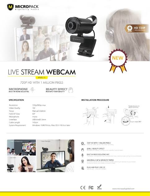 The Micropack MWB-11 720P 1MP Live Stream Webcam Black has a maximum video resolution of 720P/ 30 fps and 1MegaPixel of a physical camera pixel. You will be able to get up to 60-degree angle for the camera. The built-in microphone has noise reduction and you will be able to insert a 3.5mm headphone jack to the webcam. This webcam uses USB 2.0 and 3.5mm headphone jack for its interface and uses 145centimeter cabling. It is able to support QQ, WeChat, Skype, facebook, Zoom, Youtube, facetime, and other conferencing software. The webcam is supported by Vista/7/8/10 operating system.